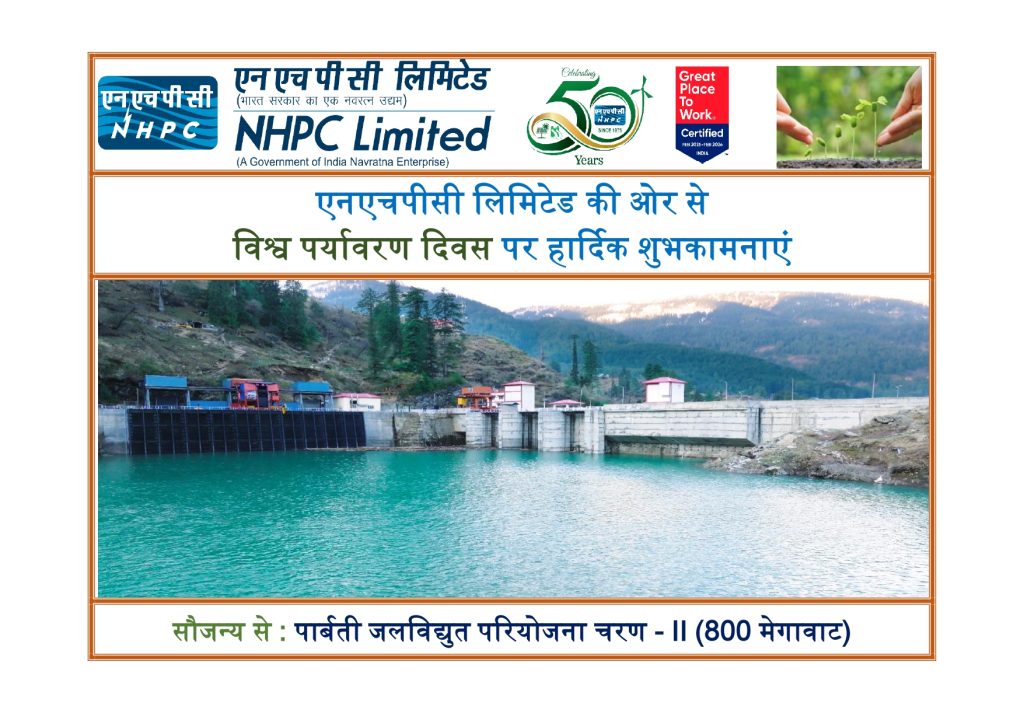 एनएचपीसी पार्बती जलविद्युत परियोजना चरण-II द्वारा विश्व पर्यावरण की वैश्विक विषय: “#Together We Can Beat Plastic Pollution.” के अंतर्गत परियोजना की विभिन्न साइटों पर विश्व पर्यावरण दिवस मनाया गया। परियोजना प्रमुख, रणजीत सिंह ने पर्यावरण संरक्षण के लिए जीवन शैली तथा ऊर्जा संरक्षण पर ज़ोर देते हुए अधिकारियों एवं कर्मचारियों को पर्यावरण संरक्षण की शपथ दिलाई। इस कार्यक्रम के अंतर्गत, परियोजना के विभिन्न स्थलों पर विश्व पर्यावरण दिवस मनाया गया। पार्बती नगवाईं कार्यालय परिसर में परियोजना प्रमुख रणजीत सिंह, द्वारा पौधारोपण किया गया। साजन मोईद्दीन, महाप्रबंधक(यांत्रिक), पवन कुमार श्रीवास्तव, महाप्रबंधक (सिविल), सुशील कुमार, महाप्रबंधक(सिविल), आर.एस.रावत, उप महाप्रबंधक (वित्त), अरविंद कौशिक, उप महाप्रबंधक(मा. सं.) और अन्य वरिष्ठ अधिकारियों द्वारा भी पौधारोपण किया गया।